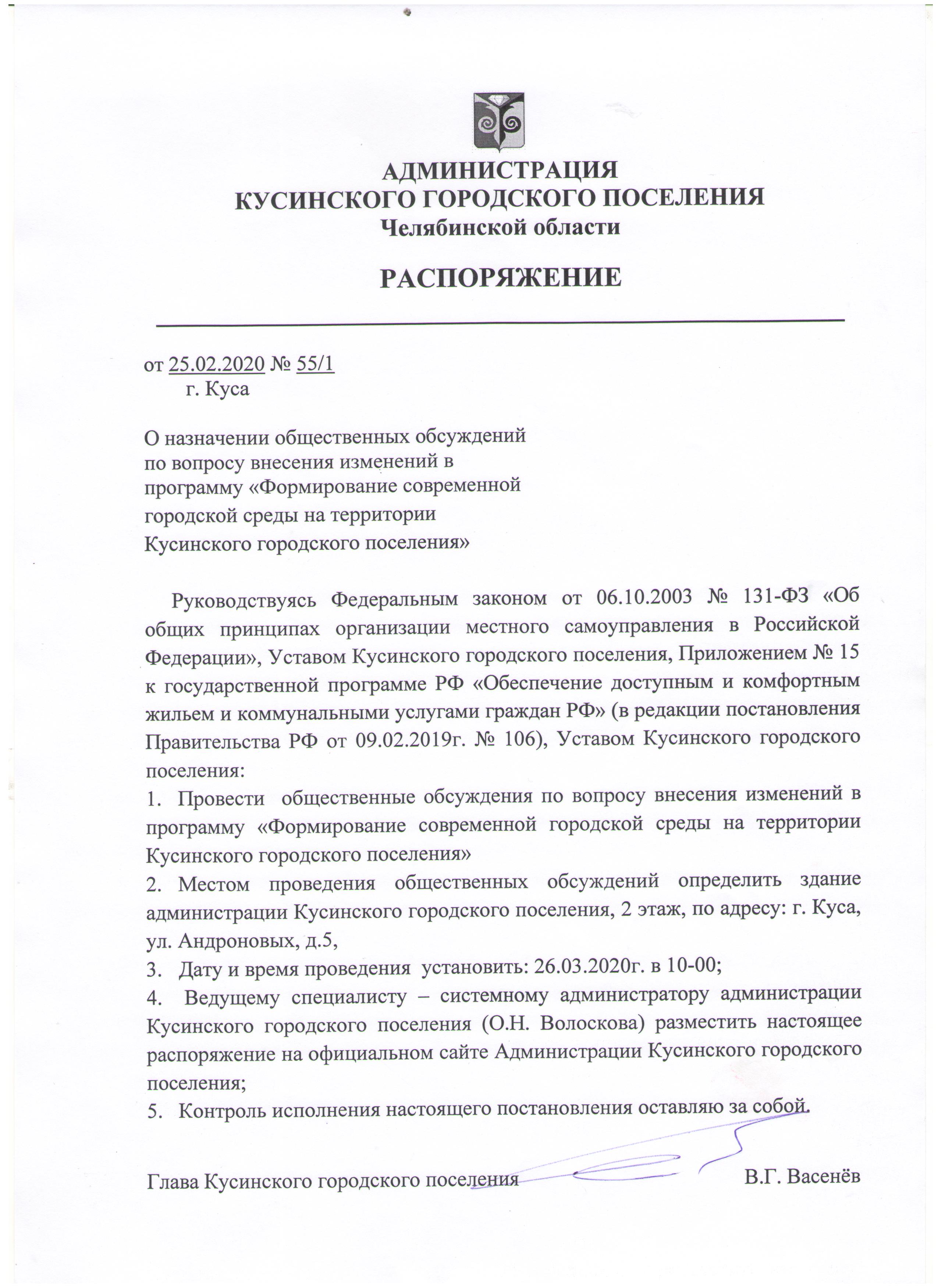 25.03.2020 Распоряжение Администрации Кусинского городского поселения от 25.02.2020 г. № 55/1